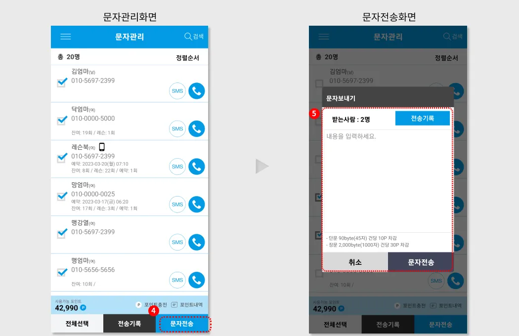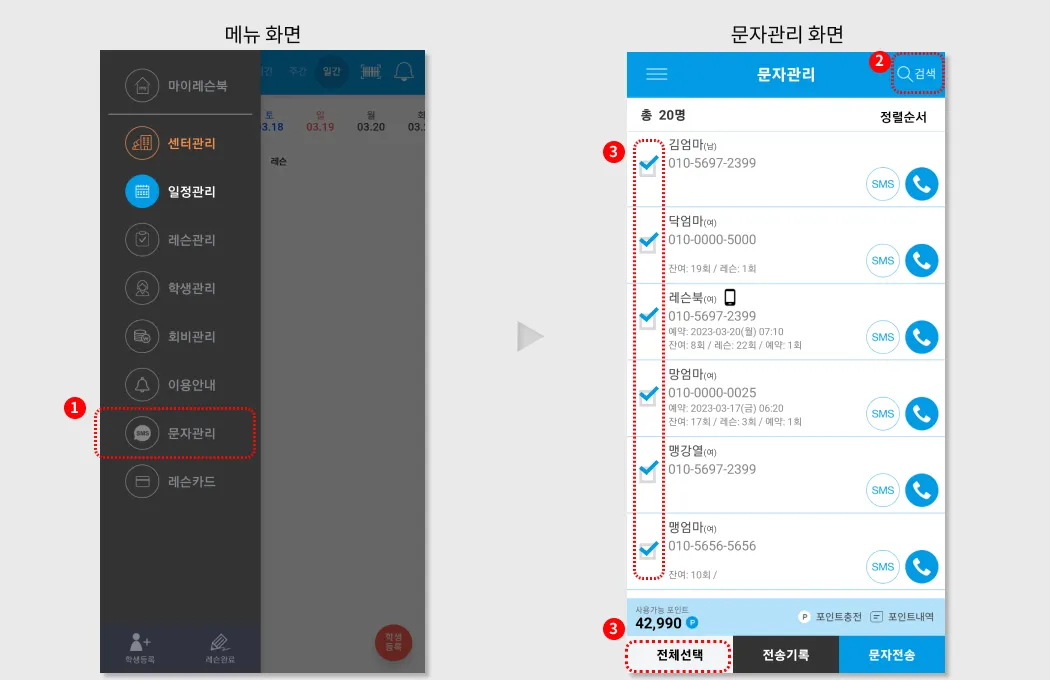 메뉴 > 문자관리 > 회원선택 > 문자전송 (문자관리에서 회원들에게 문자를 보낼 수 있습니다.)