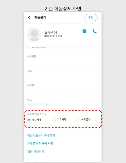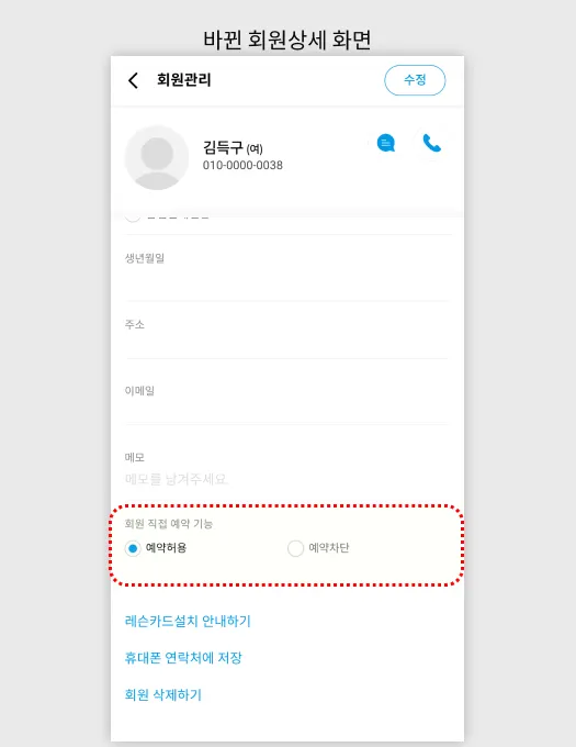 회원상세 페이지에서 무심코 ‘예약불가’를 선택하게 되어, 갑자기 회원이 예약이 안되는 상황을 막고 더욱 직관적으로 설정관리를 할 수 있도록 옵션을 개편했습니다.