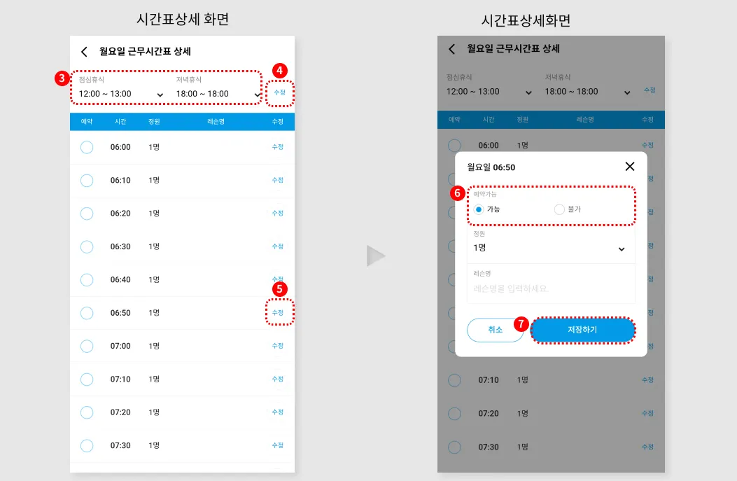 시간표 상세화면에서 레슨예약을 막고싶은 시간의 ‘수정’버튼을 눌러, 팝업을 호출합니다.’
