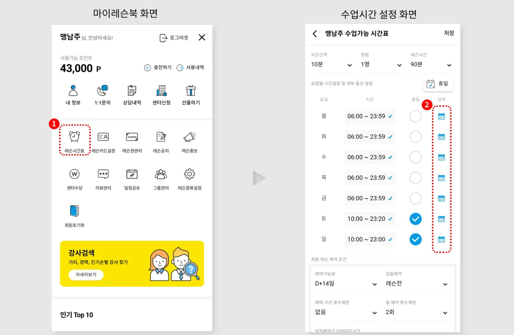 특정 시간대에 레슨예약을 막아, 휴식시간을 설정할 수 있습니다.