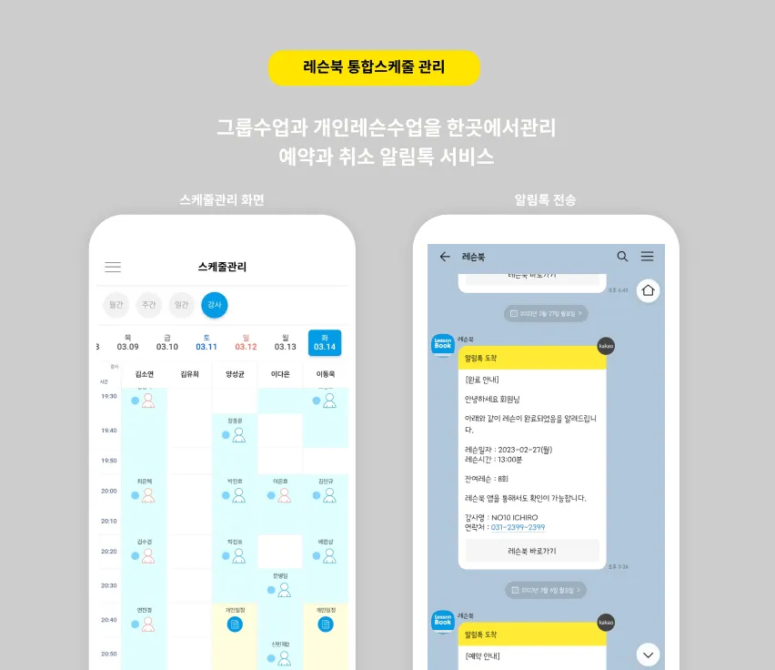 레슨스케줄을 깜박했다고요? 레슨북은 회원이 예약 / 취소 / 변경을 하면, 회원과 강사에게 자동으로 알림톡과 푸시로 알림이 전송되어 스케줄 리마인드 기능이 충실합니다.