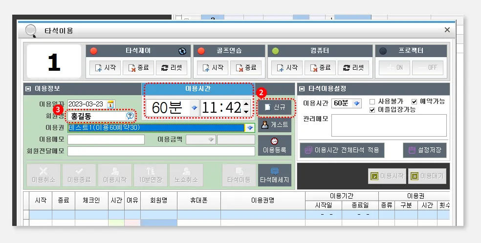 등록하려는 회원을 넣어주세요. (이대로 이용등록을 한다면, 이용시간이 60분으로 설정되어 있어, 11:42분부터 시작으로 등록이 됩니다. 지금바로 이용할 수 있도록 이용시간을 조정해주세요)