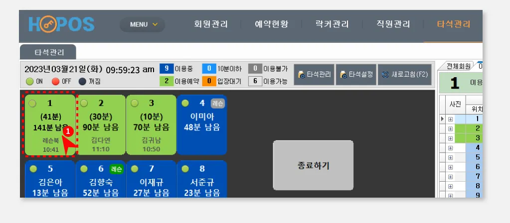 이용등록을 하고자 하는 타석을 선택합니다. (괄호안에 시간을 확인해주세요. 회원이 다음예약자 전까지 이용가능한 시간입니다)