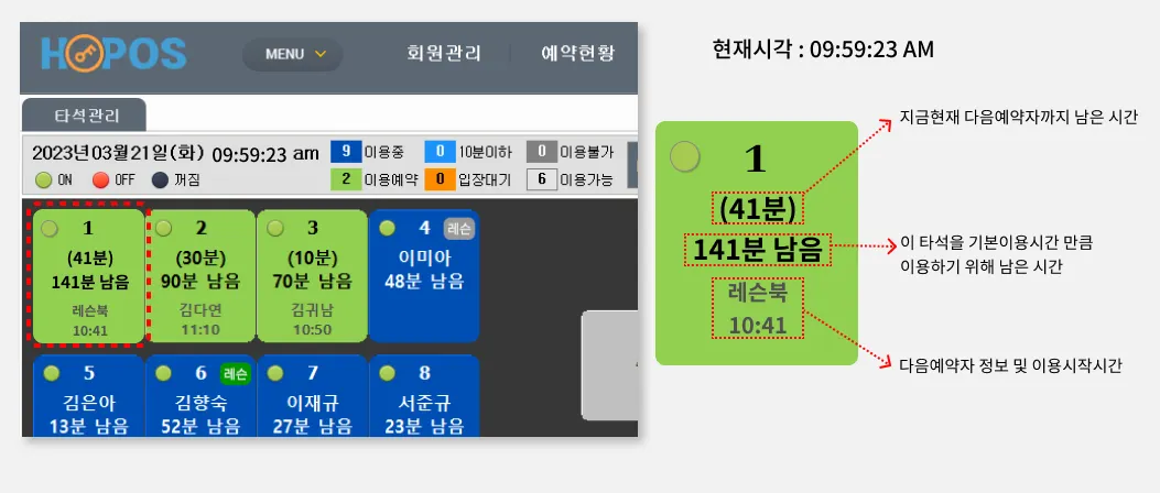 예와 같이, 타석 정보를 확인합니다. 괄호(41분)에 표시된 시간은 현재시간에서 다음 예약자의 이용시작시간까지 남은 시간을 표시합니다. 큰 글씨(141분)는 기본이용시간 만큼 이용등록을 할 수 있는시간까지 남은시간입니다.