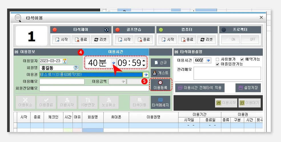 타석관리에서 이용등록을 하게 되면, 설정되어 있는 기본이용시간으로 등록이 됩니다. 예약자와 예약자 사이에 조금 비는 시간 또는 지금바로 다음예약자 시간까지 시간이 있을때이용등록을 하기 위해서는 등록시에, 이용시간을 변경해줘야 합니다.