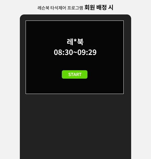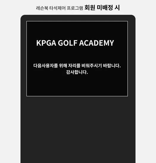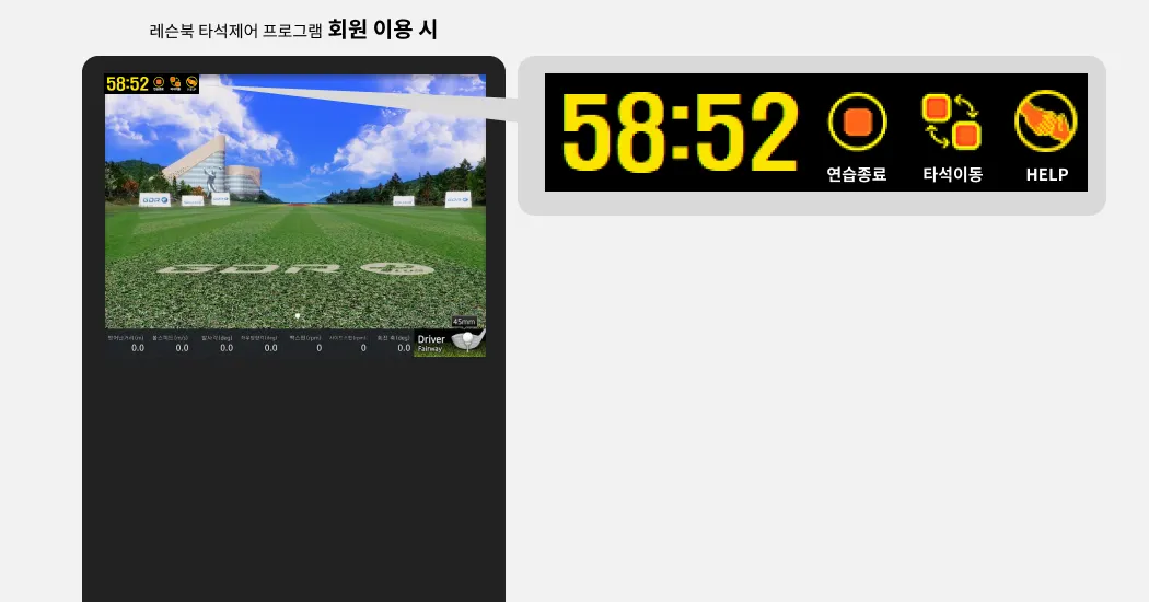 레슨북 타석제어 프로그램은, 각 타석에 설치되는 프로그램으로, 서버와 통신을 하게 해주어 예약자 정보를 표시하고, 예약자가 없을 때는 사용을 못하도록 스크린으로 타석화면을 가립니다. 타석의 이용상태 등의 정보를 서버에 전달하고 서버와 통신하여, 실시간으로 정보를 갱신합니다.