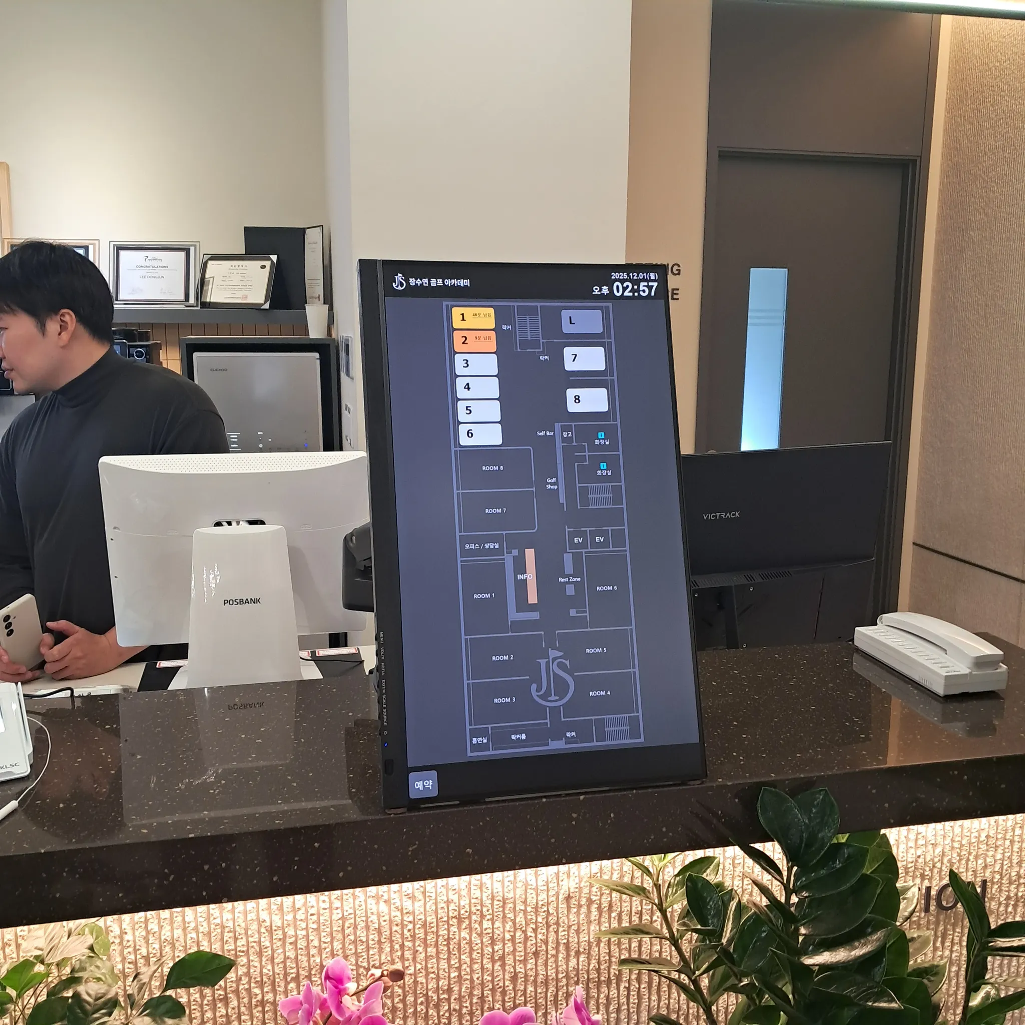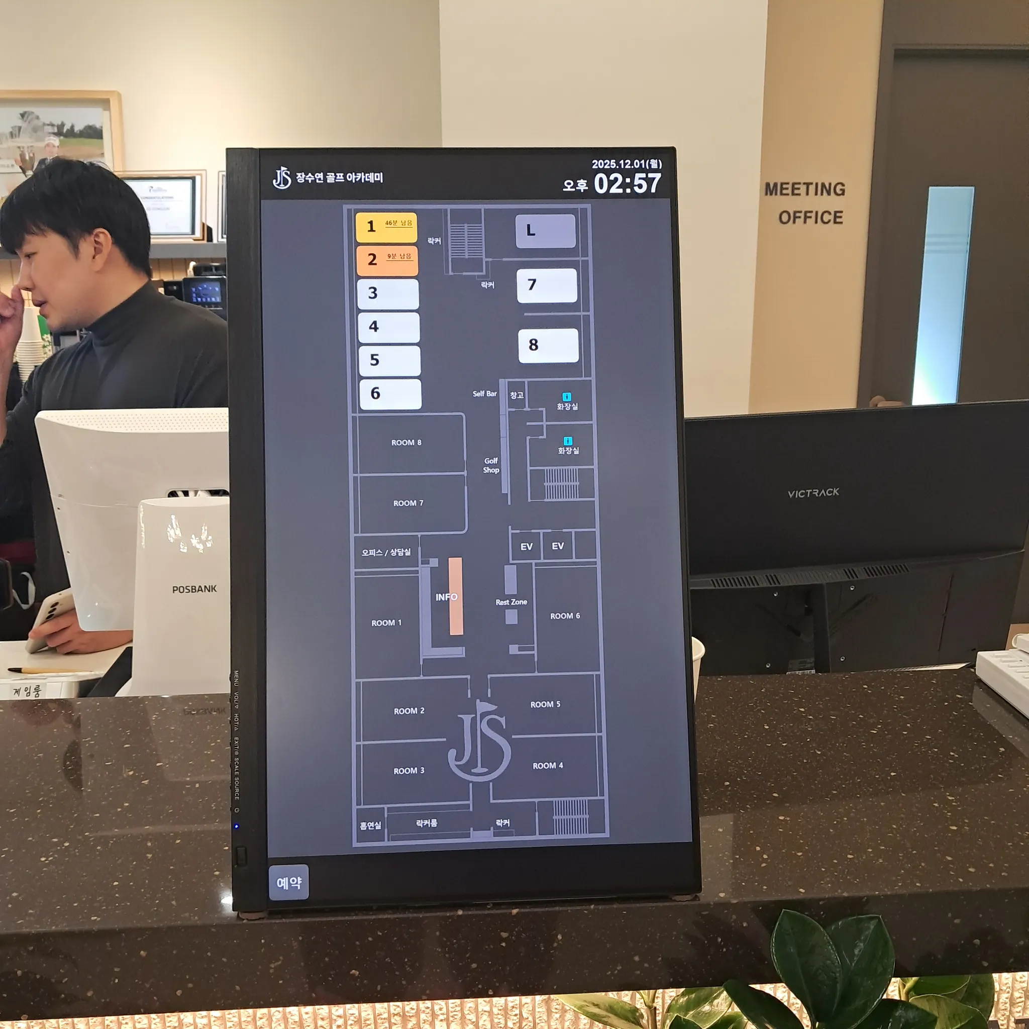 레슨북 시그니처 : 매장의 레이아웃을 그대로, 회원은 자신이 원하는 타석의 위치를 직관적으로 확인가능합니다. 타사의 키오스크에 레슨북 프로그램을 설치했습니다.