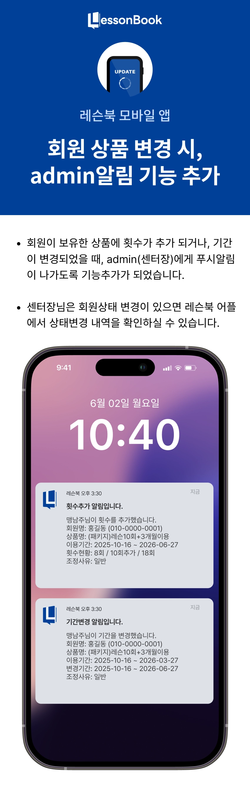 레슨 횟수가 조정되거나 상품의 기간이 변경될 때, admin에게 해당 내용이 푸시 알림으로 전송됩니다.