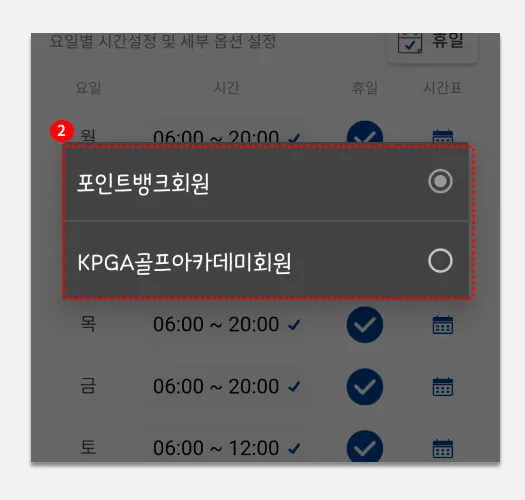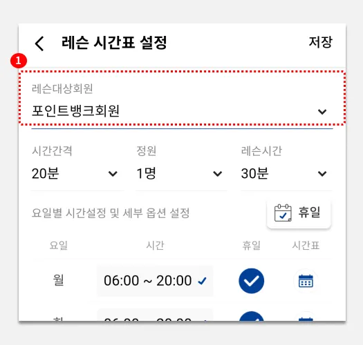 레슨 대상회원을 선택하고 근무시간을 설정합니다. 등록된 센터별, 개인레슨 회원의 근무시간의 설정이 가능합니다.