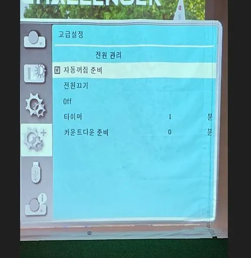 메뉴 > 상세메뉴 > 기타 > 자동전원 꺼짐 ‘1분’으로 설정 >> 전원자동끄기
