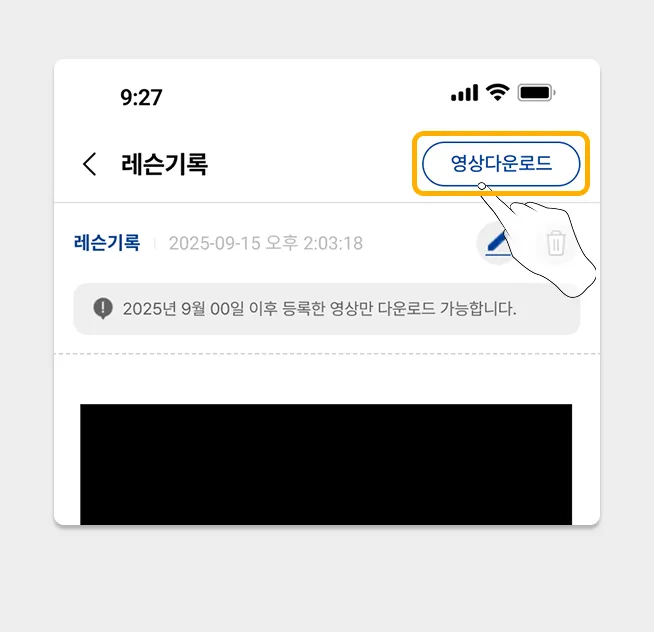 강사님이 남겨주신 레슨기록의 동영상을 다운받을 수 있습니다. 강사님이 남겨주신 영상을 휴대폰에 저장하세요. 2025년 9월 18일 이후부터 등록된 영상만 다운로드가 가능합니다.