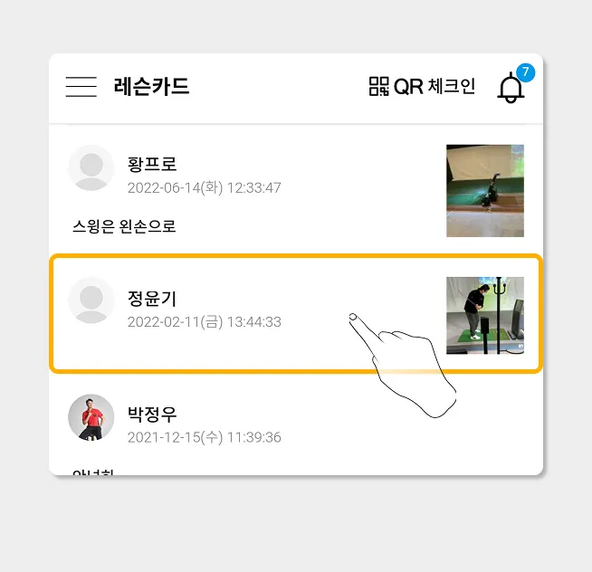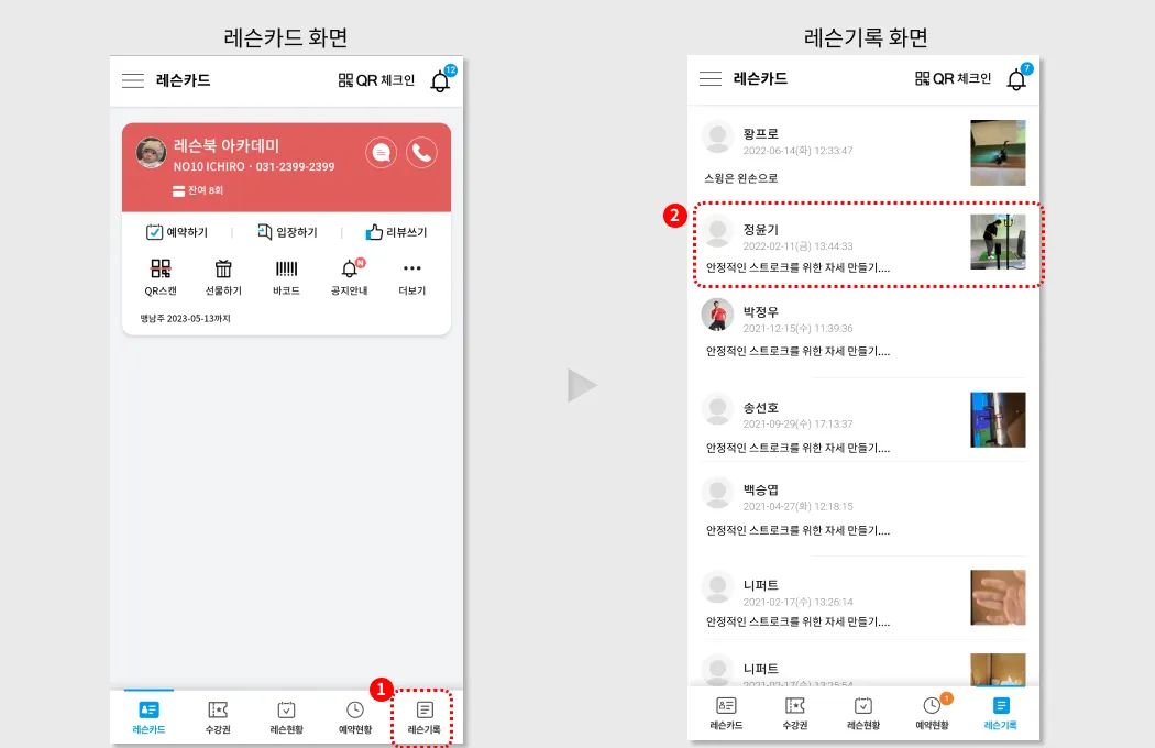 레슨카드 하단 ‘레슨기록’탭을 선택해, 레슨기록 화면을 호출합니다.