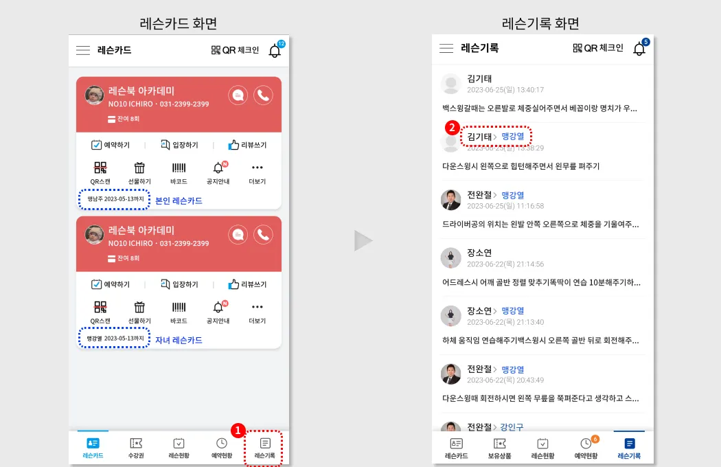강사님이 남겨주신 레슨기록을 확인할 수 있습니다. 본인 외, 자녀의 레슨기록도 함께 확인할 수 있습니다. (레슨카드 하단, ‘레슨기록 탭’ 선택)