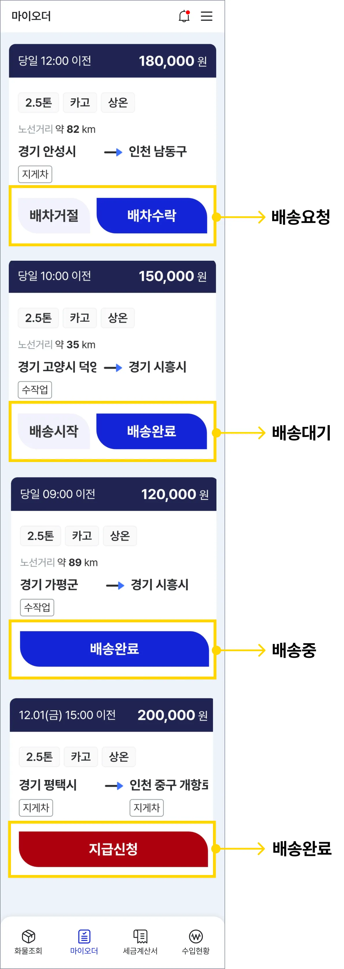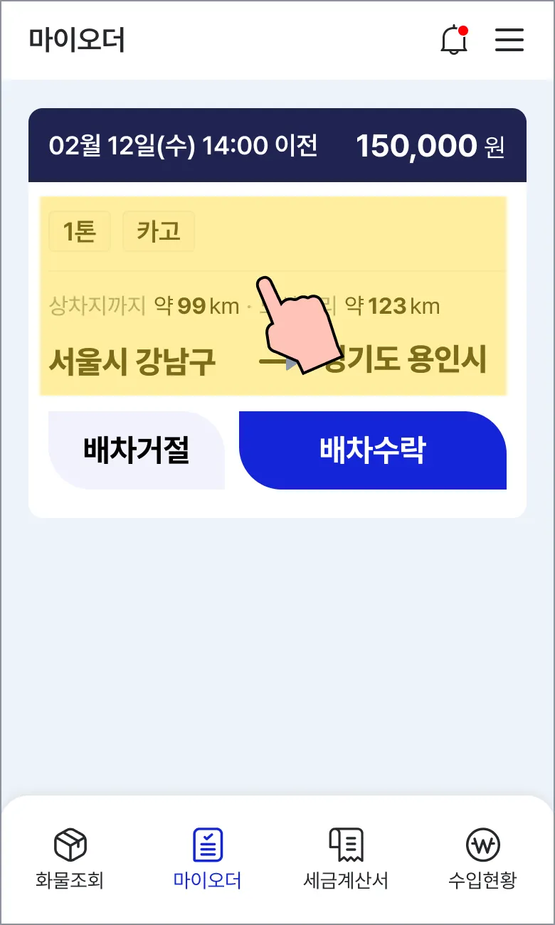 마이오더 메뉴에서는 회원에게 요청되었거나, 회원이 직접 수락한 배차정보를 확인 할 수 있습니다