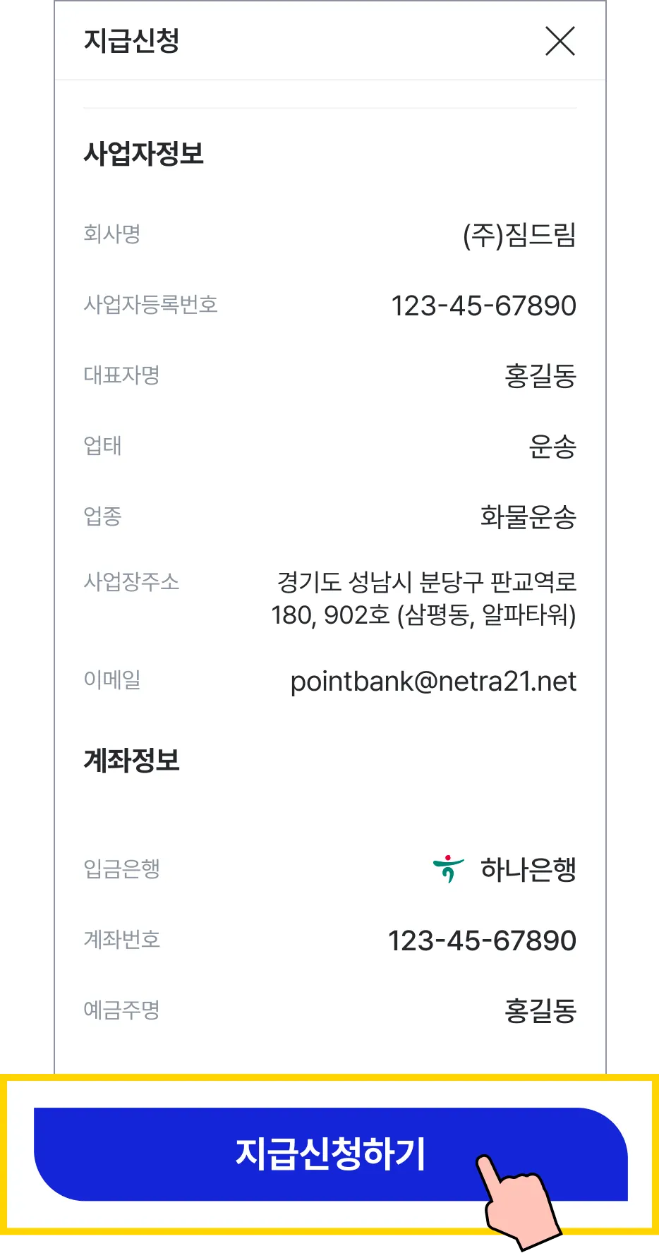 사업자정보와 계좌정보를 확인 후 지급신청하기를 선택합니다.