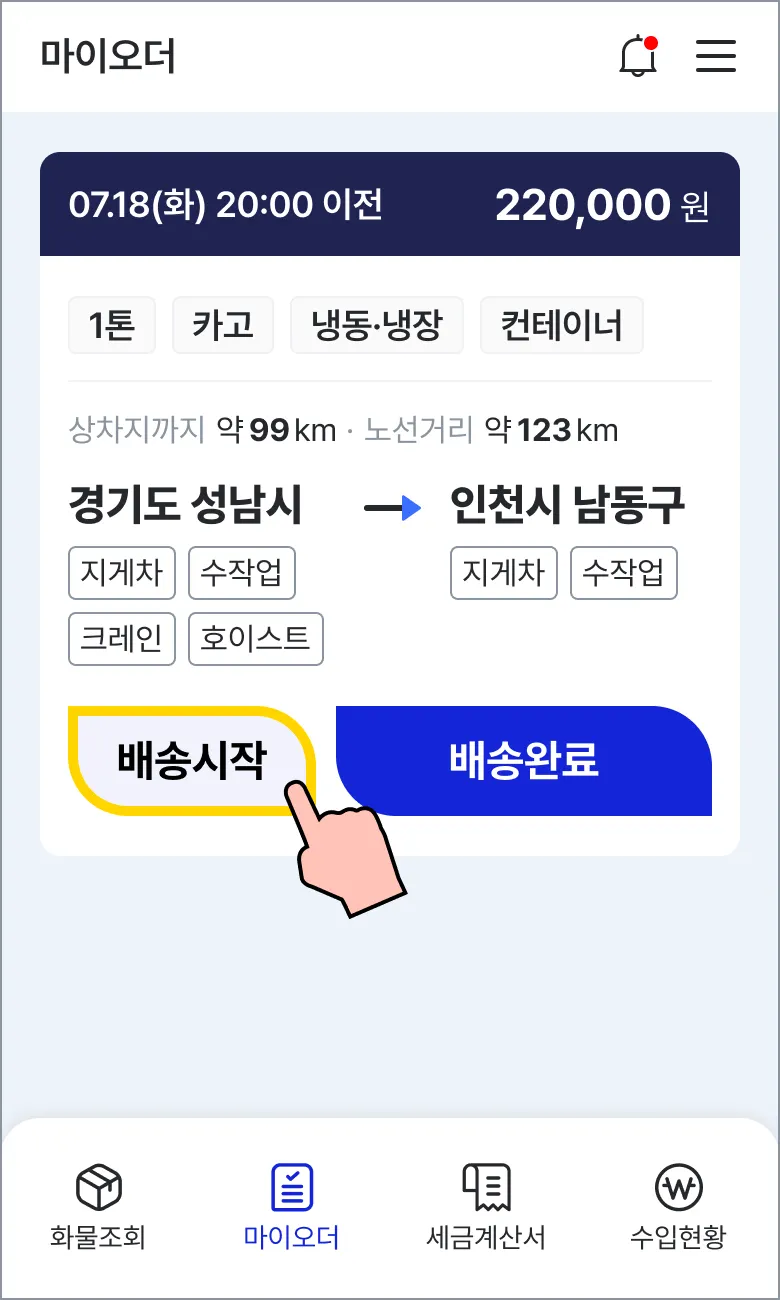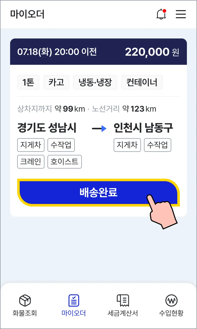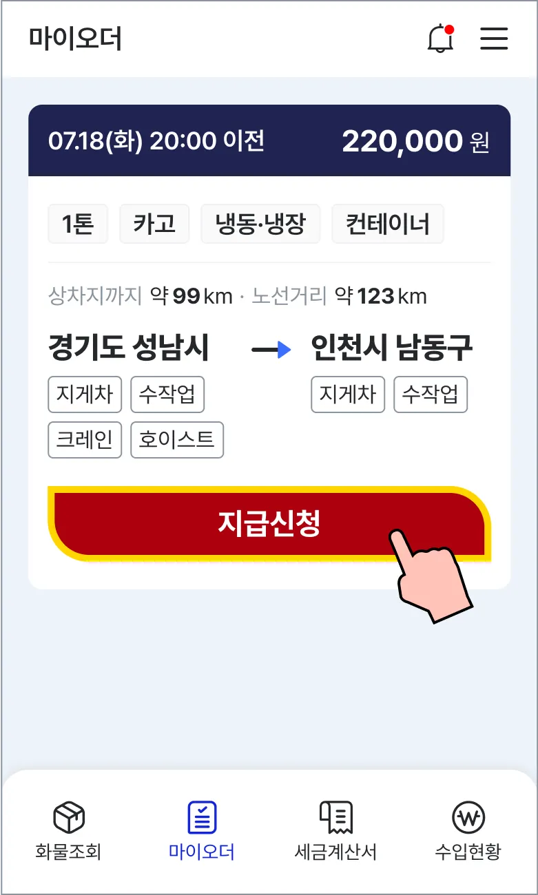 지급신청이 완료된 배차건은 마이오더에서 제외되고, [세금계산서] 또는 [수입현황]에서 확인 가능합니다.
