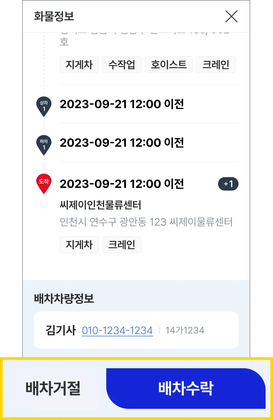 상세정보 확인 후, 배차 수락 또는 거절을 선택합니다.