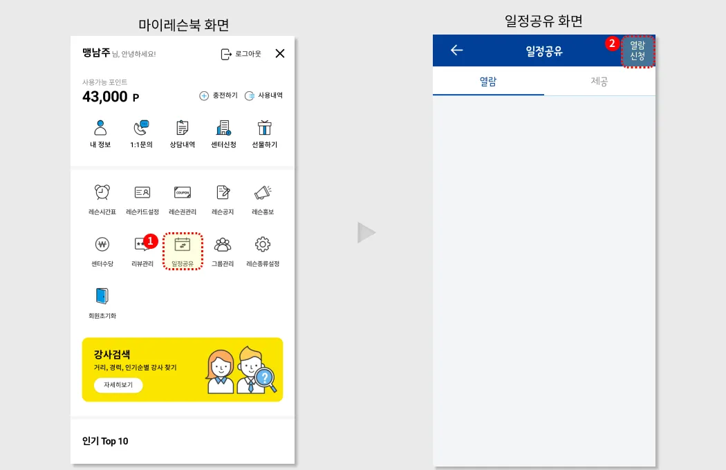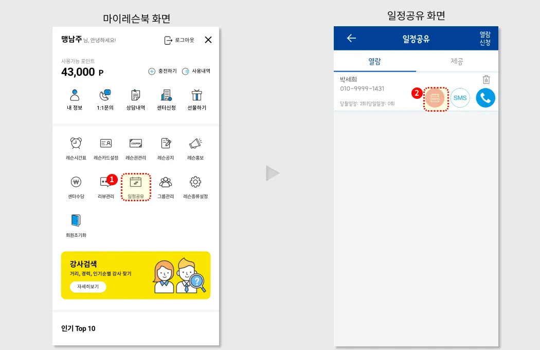 마이레슨북 화면에서 일정공유를 선택합니다.