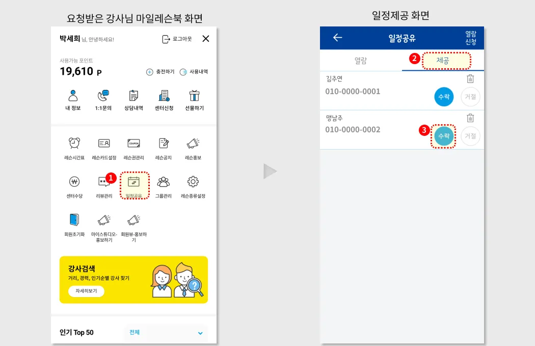 요청을 받은 강사님은, 마이레슨북 화면에서 ‘일정공유’를 선택합니다.