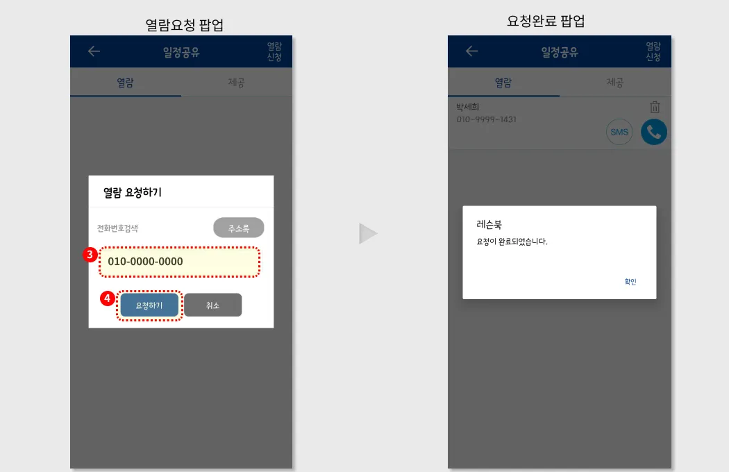열람요청하기 팝업창에서, 일정공유를 받고 싶은 강사님의 연락처를 입력합니다.