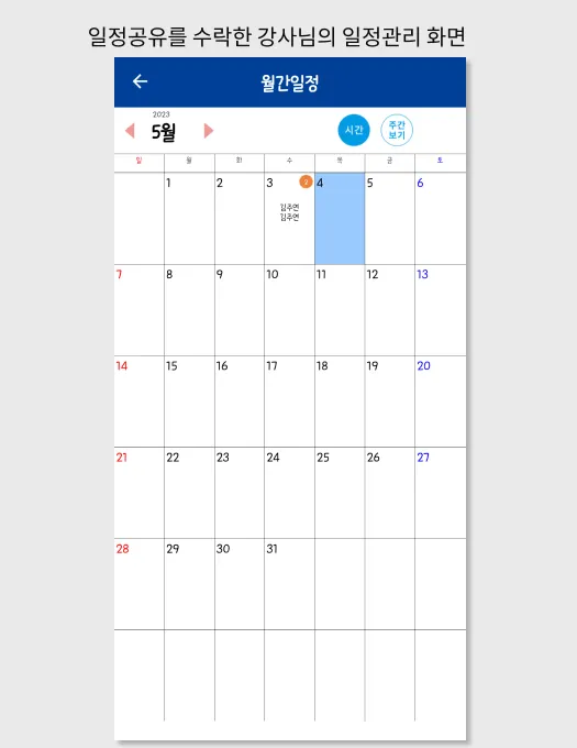 센터버전을 사용하지 않는 프리랜서 강사님들도 다른강사님과 일정을 서로 공유해서 관리할 수 있습니다.