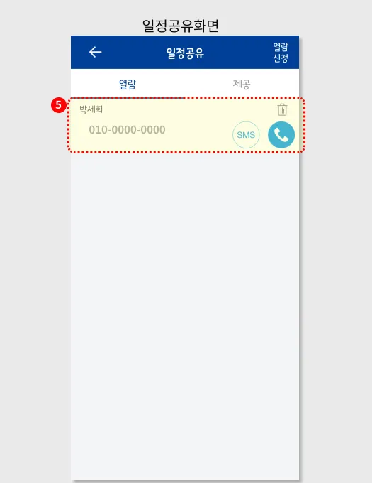 일정공유 화면에서, 열람요청이 온 것을 확인하기 위해 ‘제공’을 선택합니다.