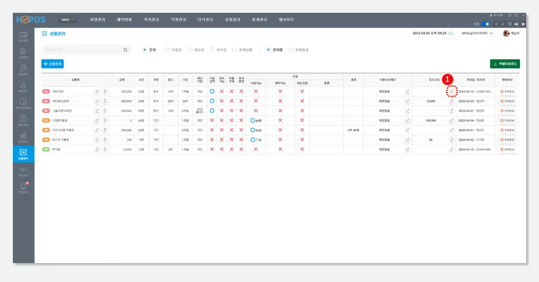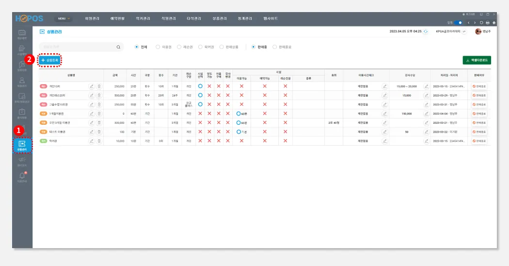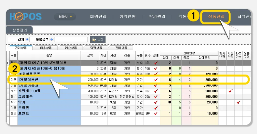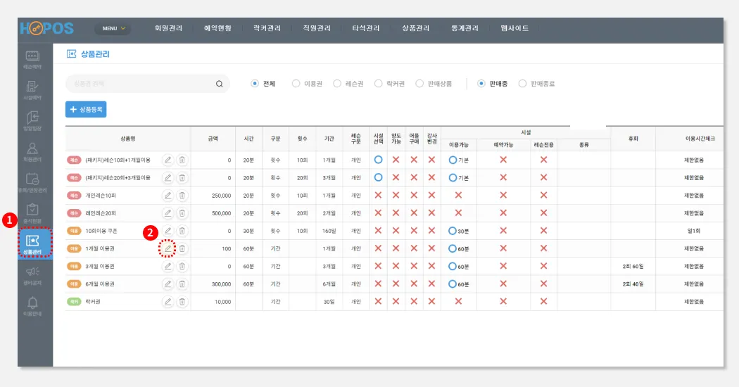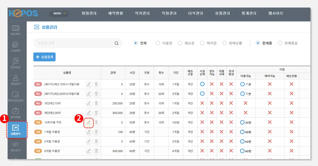 시설이용을 가능으로 선택해, 유효기간사이 레슨도 받고, 이용도 할 수 있는 상품을 만듭니다.