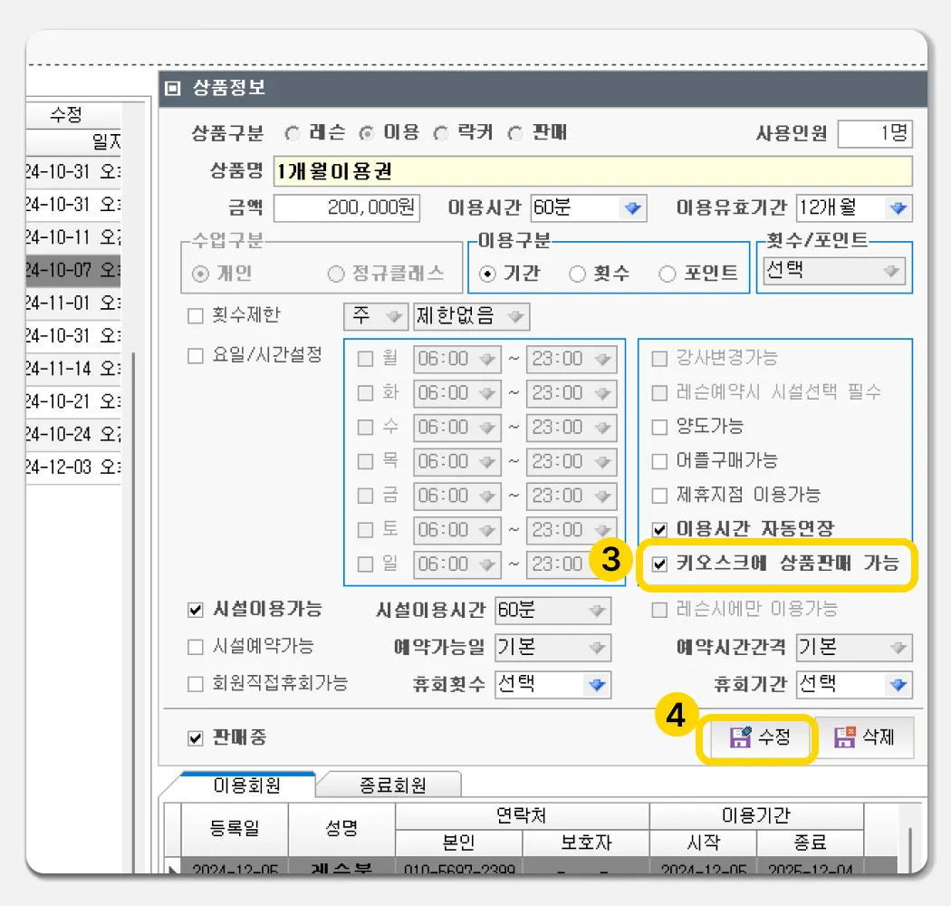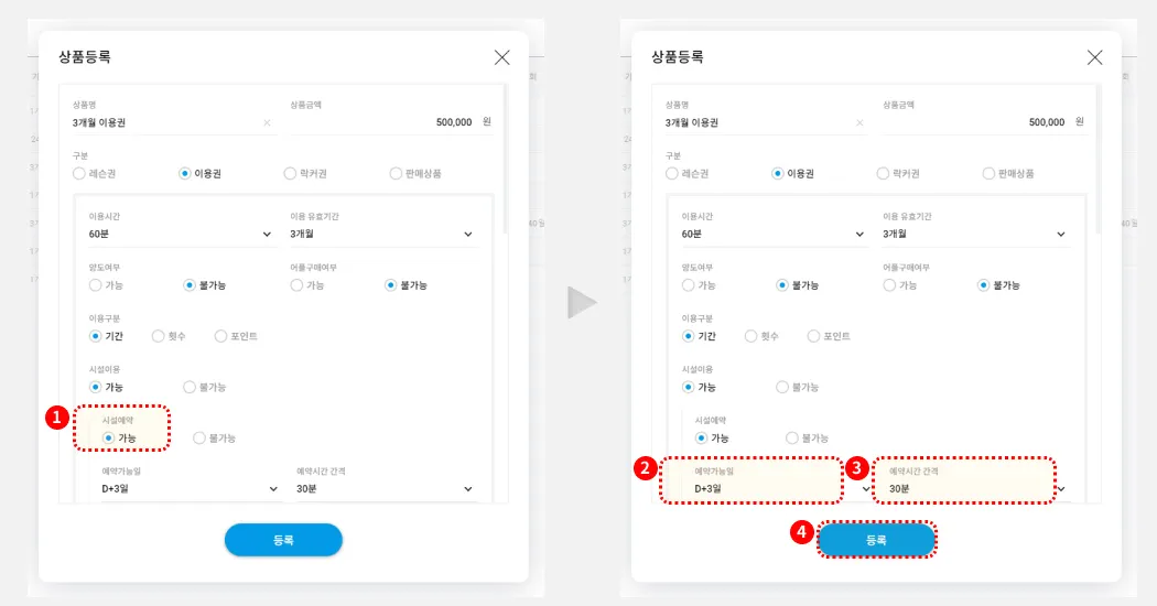 (2)에서 만드신 기간이용권에, 시설예약 옵션을 ‘가능’으로 설정합니다.