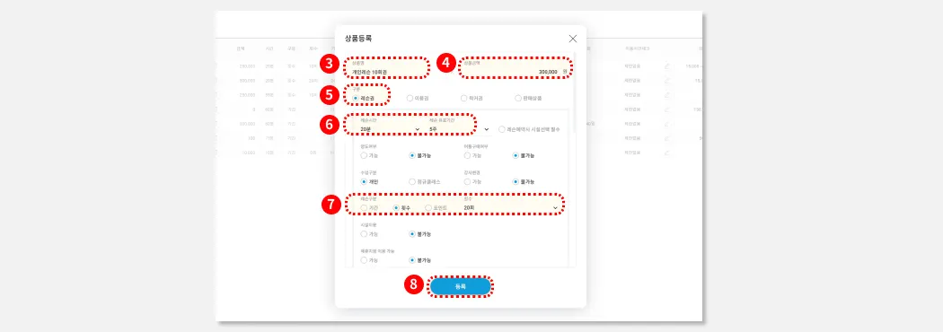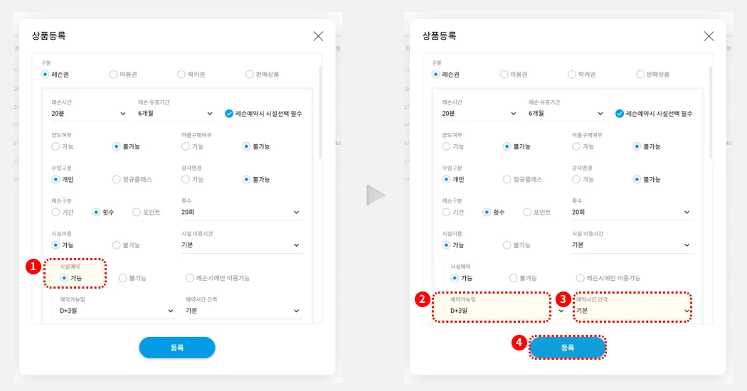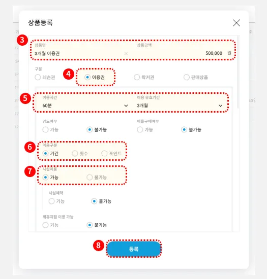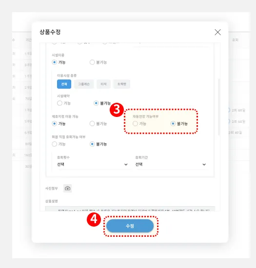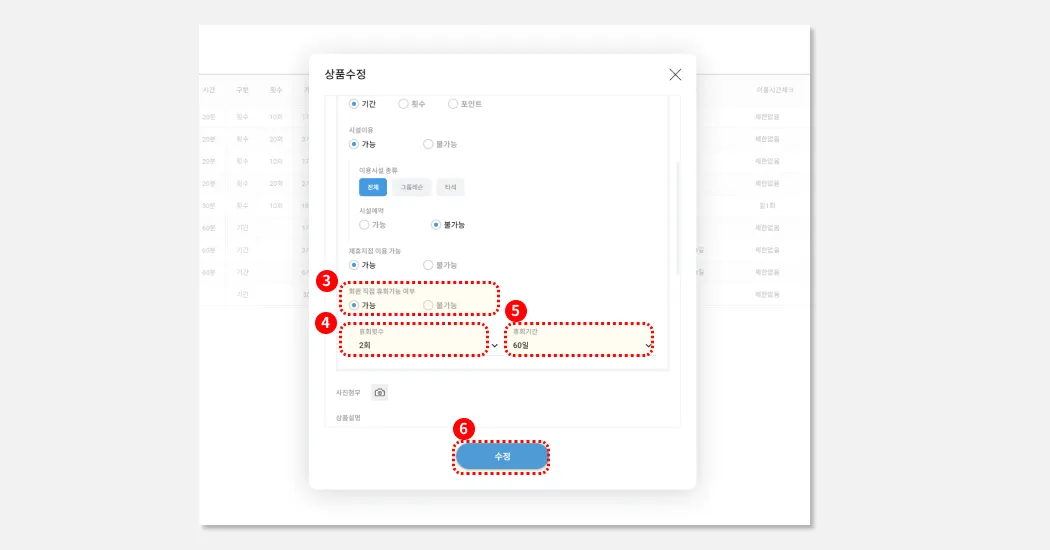 (2-4)에서 만드신 횟수이용권에, 시설예약 옵션을 ‘가능’으로 설정합니다.