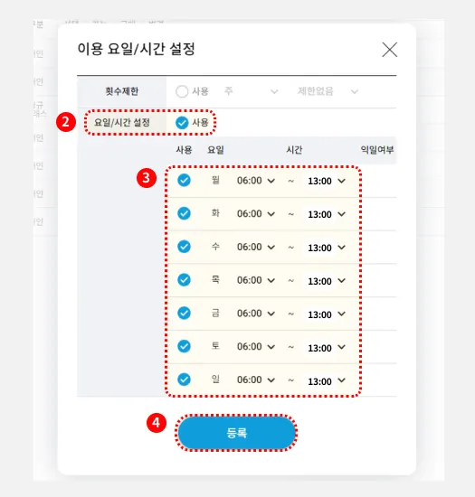 이용요일 시간제한 팝업에서, ‘요일/시간 설정 사용’을 선택합니다.