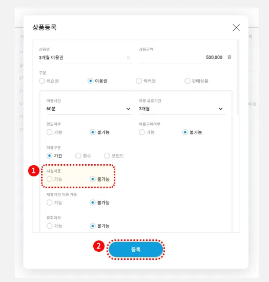 (2)에서 만드신 기간이용권에, 시설이용옵션을 ‘불가능’으로 선택합니다.