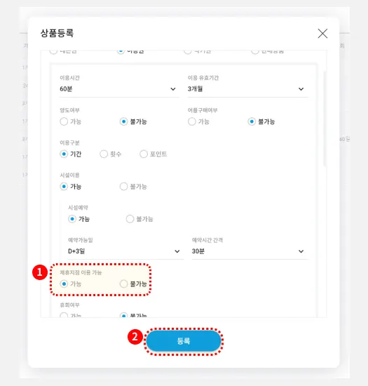 (2)에서 만드신 이용권에, 제휴지점 이용가능 옵션을 ‘가능’으로 설정합니다.
