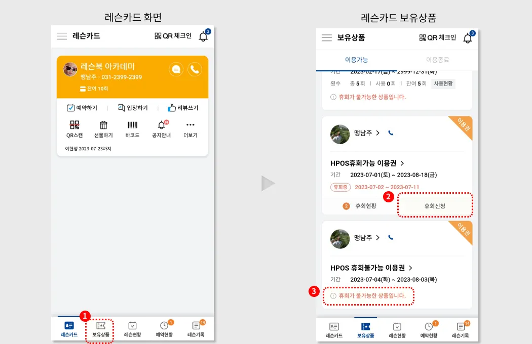 레슨카드에서 ‘보유상품’선택