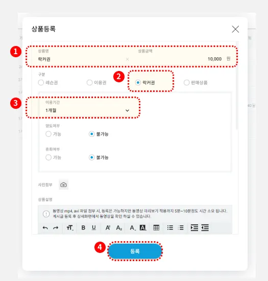 등록을 눌러, 락커권 등록을 완료합니다.