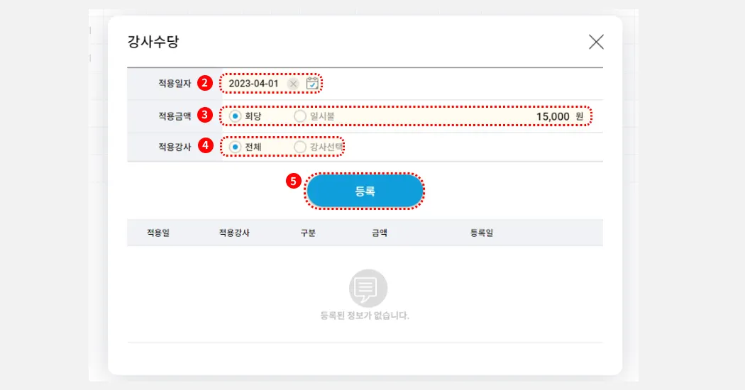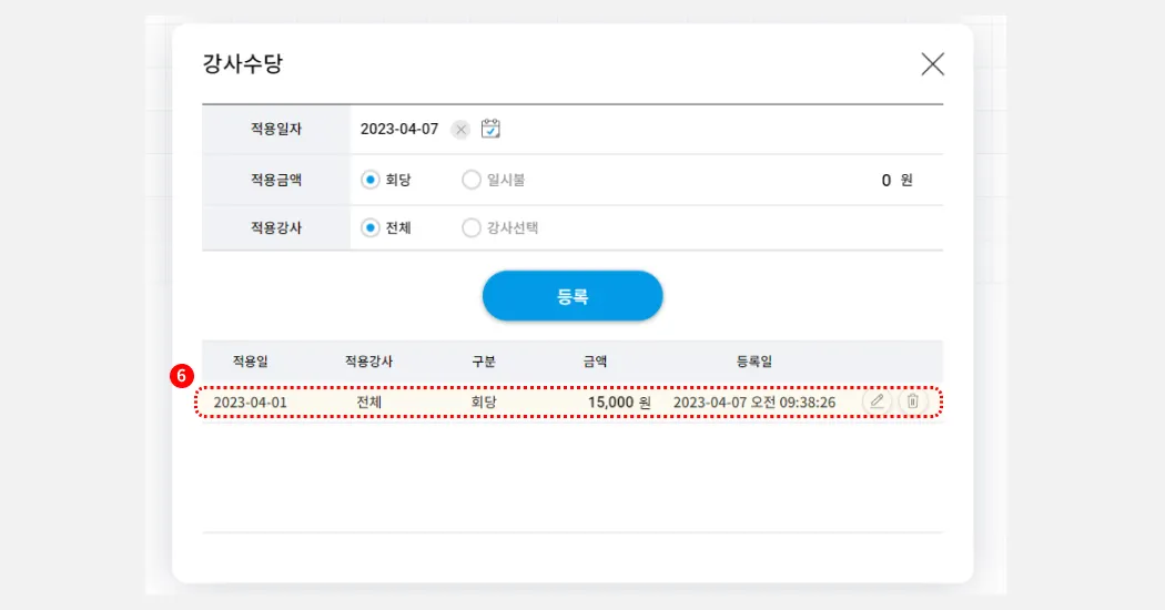 등록을 눌러, 강사수당등록을 완료합니다.