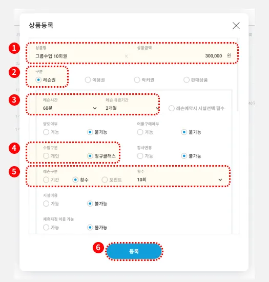 등록을 눌러, 레슨권 등록을 완료합니다.