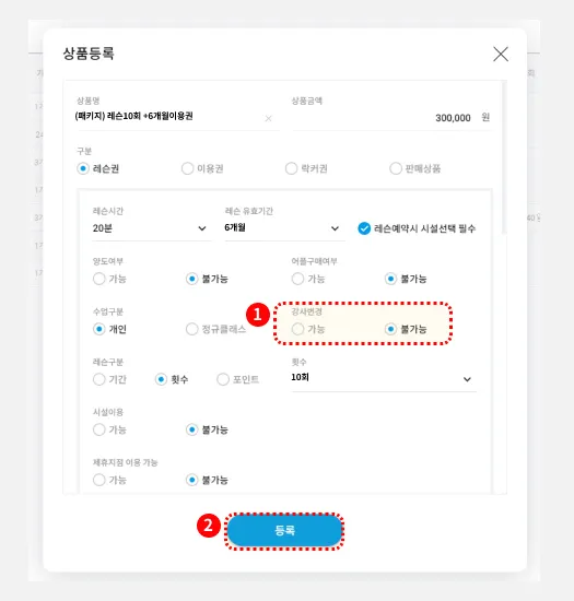 앞서 만든 레슨 상품 중에서, 강사를 변경해 예약할 수 있는 레슨권을 만들고자 할 때는, 강사변경 옵션을 ‘가능’으로 선택합니다.