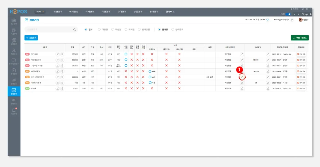 HPOS좌측 메뉴에서, 상품관리를 선택하세요 (기본값은 ‘레슨예약’)
